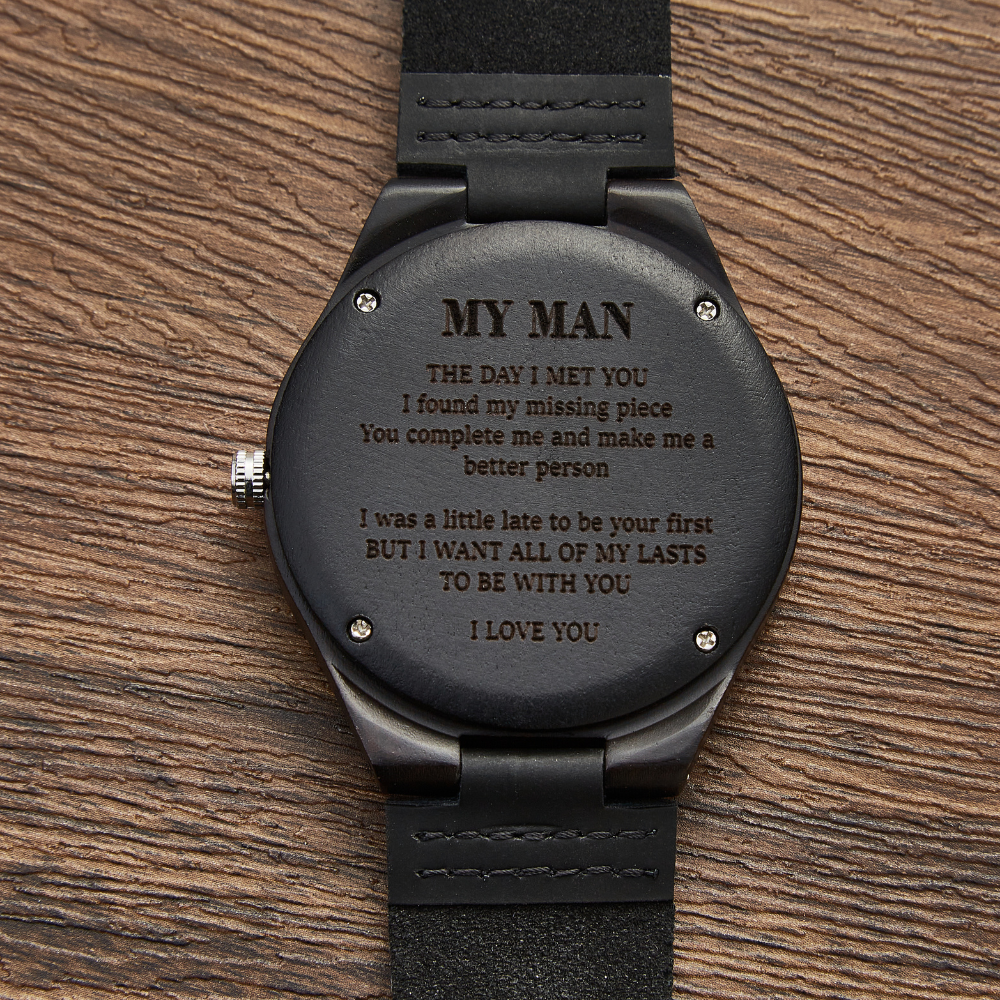 Introducing Engraved Wooden Watch, a watch that's more than just a timekeeper; it's a symbol of enduring love and admiration. Crafted with precision, this watch features the heartfelt engraving "My Man," making it a deeply personal and meaningful gift for the special man in your life.
