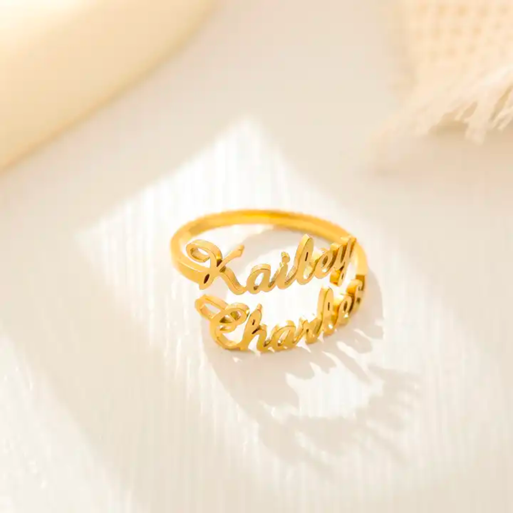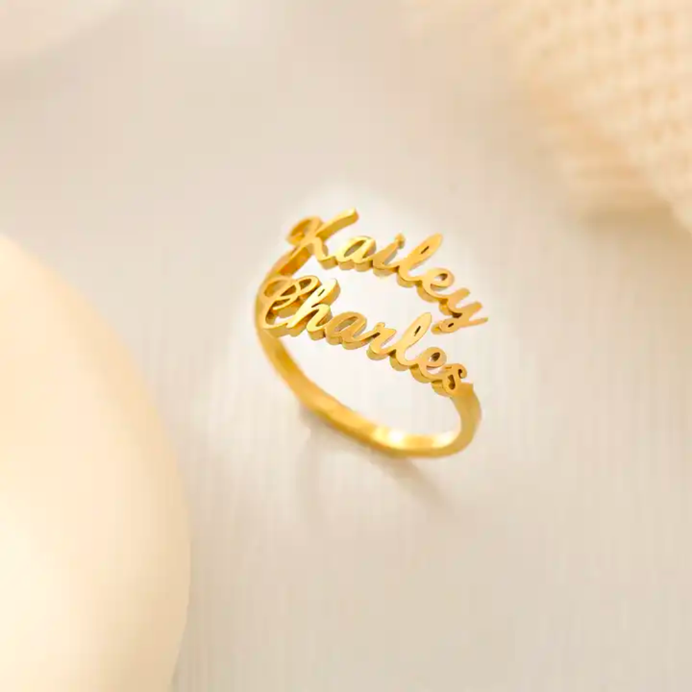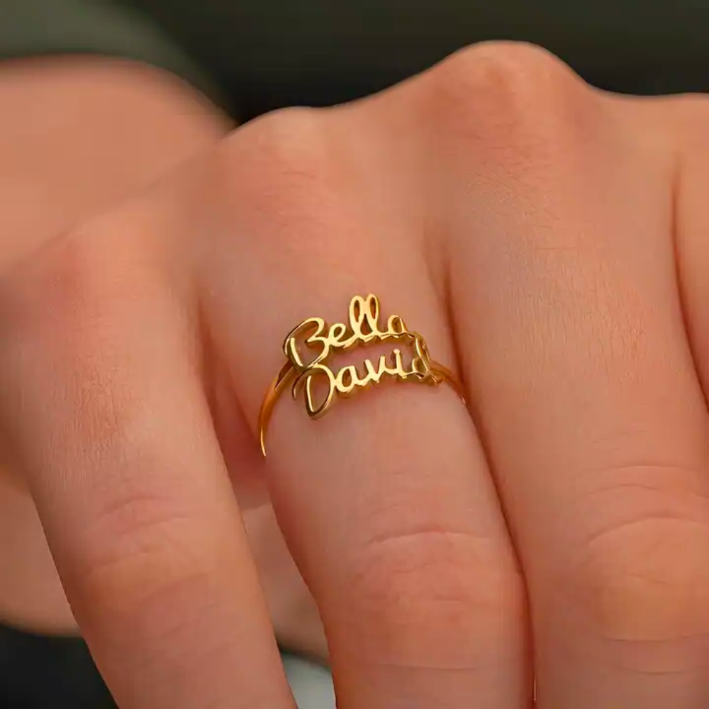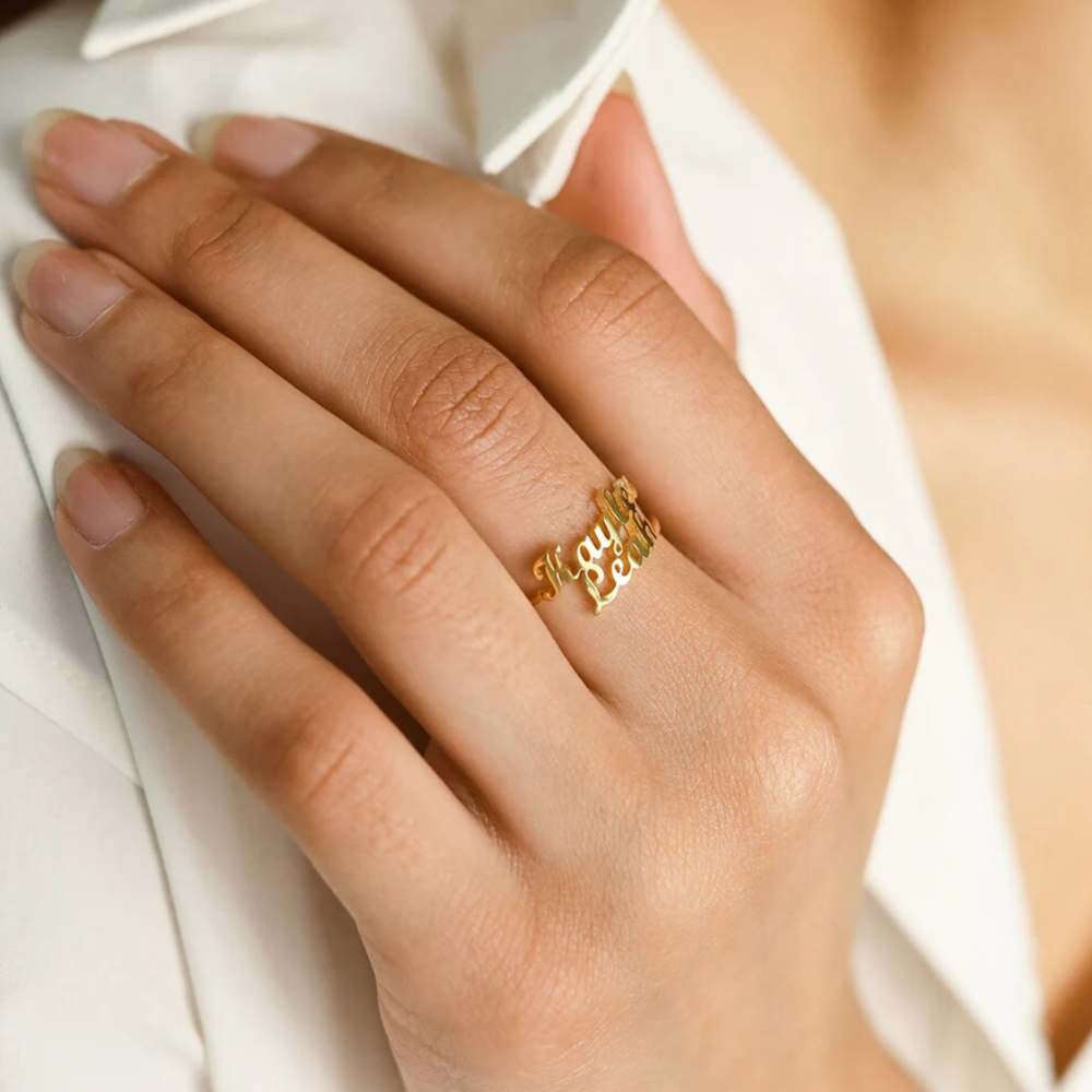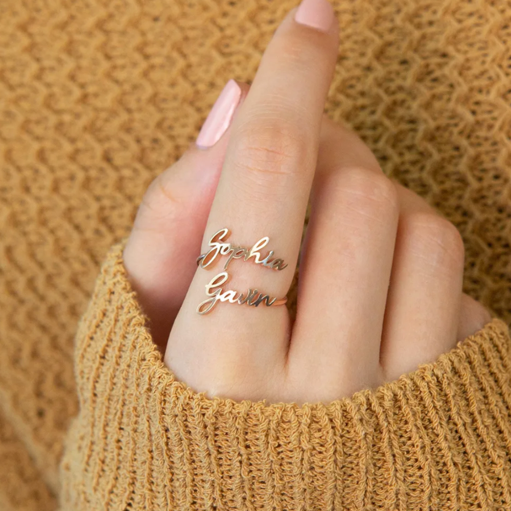 The Minimalist Double Name Ring offers a unique and beautiful way to carry the names of your loved ones close to you at all times. This trendy ring is the perfect personalized gift for moms or best friends, celebrating the special bond you share. Its elegant design and the intimate touch of having two names make it a fashionable and meaningful accessory for any woman.